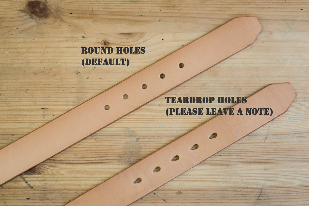 Each belt is made with 5 belt holes, each 1 inch apart. By default, the belt holes on the belt are round, but teardrop holes are available upon request. Please leave a note during checkout if you would like teardrop holes.
