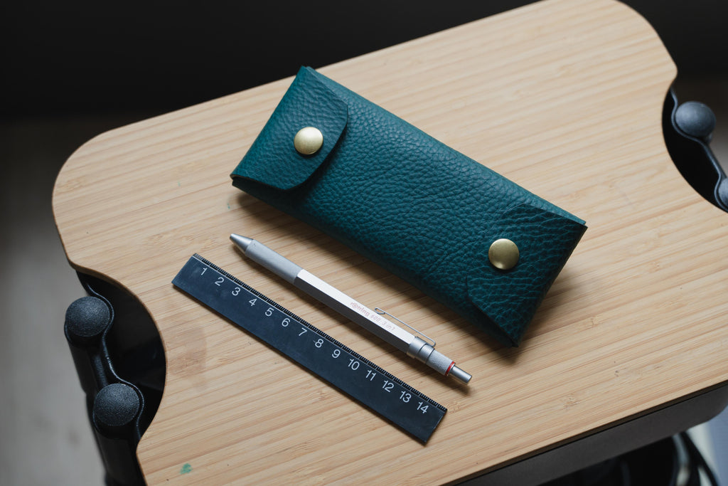 You're looking at a unique stitch-less design pen case crafted from Minerva Box pebbled vegetable tanned leather. The pen pouch is held together by three really high quality and durable solid brass snap buttons. The pens inside can be accessed from all three openings, making the pen case super versatile in actual use!