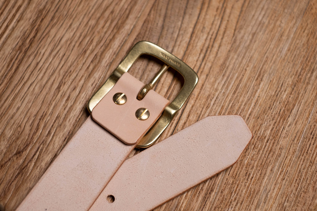 The 1.5" wide leather belt is constructed from 10 oz heavyweight Italian vegetable-tanned leather. The item features solid brass hardware, a classic rectangle garrison buckle and brass Chicago screws.